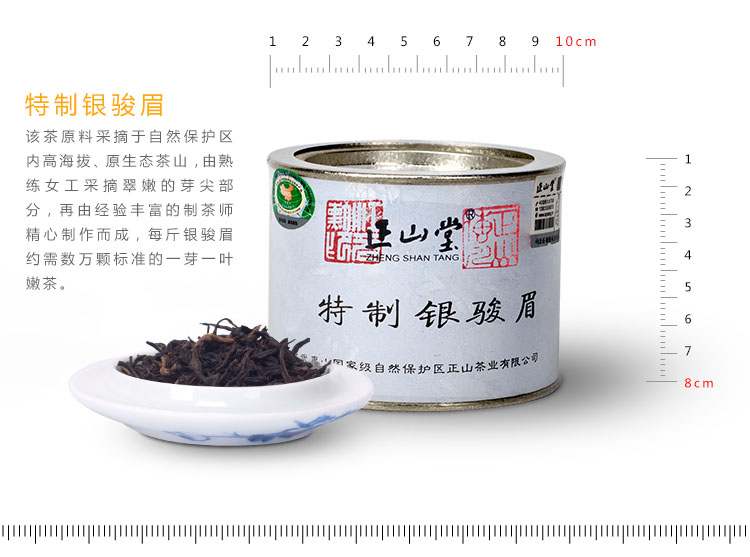 正山堂银骏眉是本公司在正山小种红茶传统工艺的基础上于2005年创新研制的高端红茶。该茶原料采摘于自然保护区内高海拔、原生态茶山,由熟练女工采摘翠嫩的芽尖部分,再由经验丰富的制茶师精心制作而成,每斤银骏眉约需数万颗标准的一芽一叶嫩茶。银骏眉外形条索紧细,锋苗显秀,光泽油润,汤色金黄澄澈,香气独特、清高持久,是一种花香、果香与薯香混合的综合香型。滋味鲜活甘爽、喉韵悠长,蕴含着丰富且鲜活持久的香气。