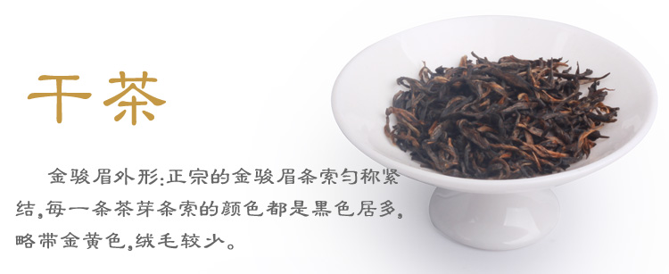 - 【主要特征】:外型细小而紧秀,颜色为金、黄、黑相间,细看,金黄色的为茶的绒毛、嫩芽。干茶有着桐木原始保护区的特殊甜香气,开汤汤色为金黄色,啜一口入喉,甘甜感顿生。其水、香、味似果、蜜、花、薯等综合香型,滋味鲜活甘爽,喉韵悠长,沁人心脾,仿佛使人置身于原始森林之中!