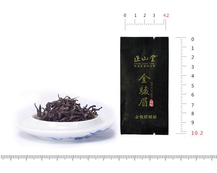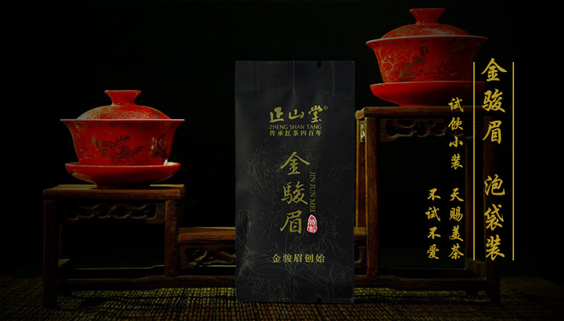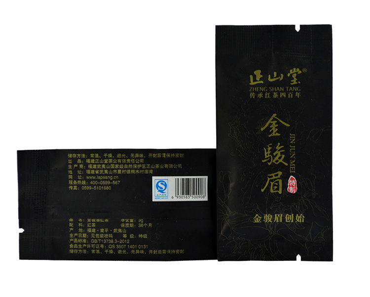 正山堂,专注于每一个细节,试饮装皆由高档食品级铝箔泡袋承装,泡袋背面为产品信息介绍,正山坚持,品质保证,红茶源自正山!