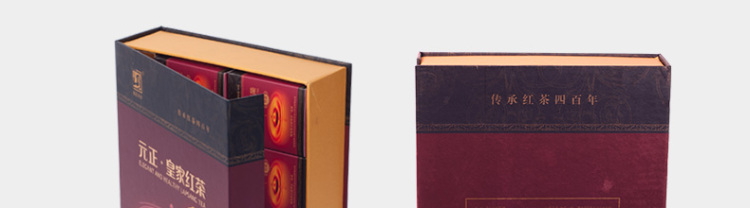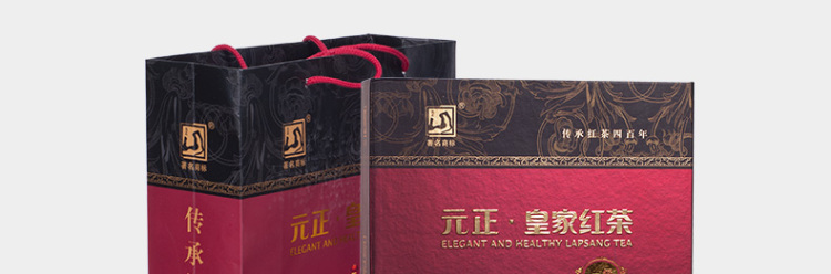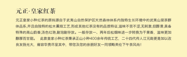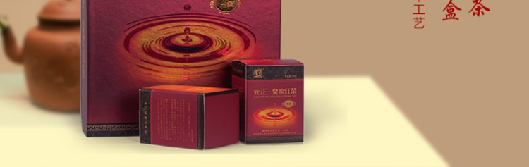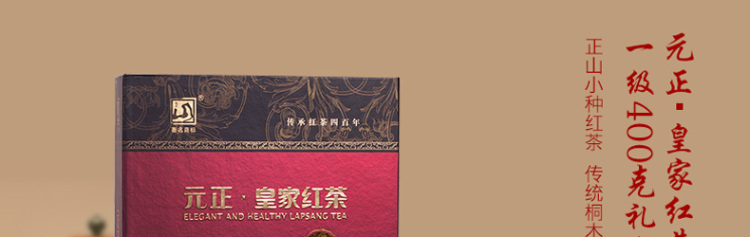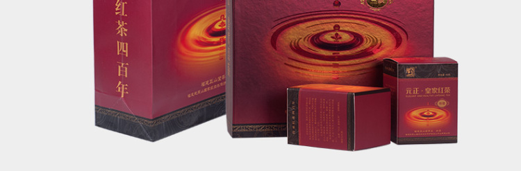 元正皇家红茶400克礼盒装,内部由8个精致的小盒组成,每个小盒内的重量为50克,含10泡。元正皇家小种红茶的原料源自于武夷山自然保护区天然森林体系内独特生长环境中的武夷山菜茶群体品系,并且由独特的松木熏焙工艺,形成其他红茶没有的品质特征。