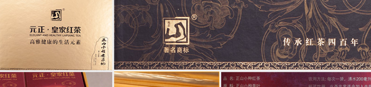 元正皇家红茶400克礼盒装,内部嵌有商标,从礼盒的背面,您能够找到详细的公司信息,生产日期以及联系方式。元正皇家小种红茶的原料源自于武夷山自然保护区天然森林体系内独特生长环境中的武夷山菜茶群体品系,并且由独特的松木熏焙工艺,形成其他红茶没有的品质特征。