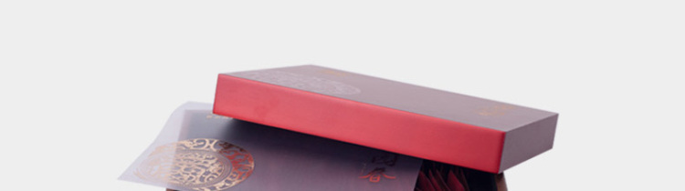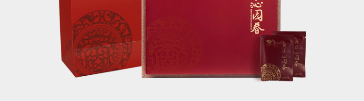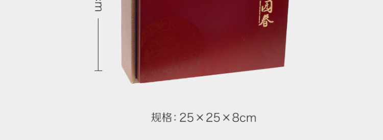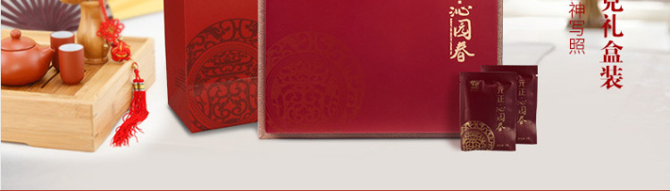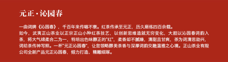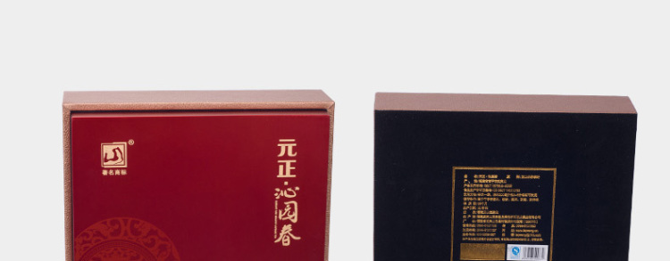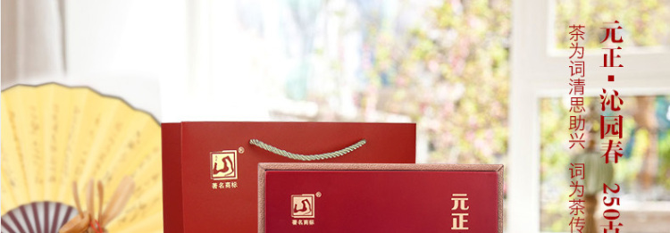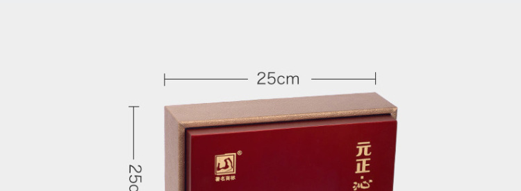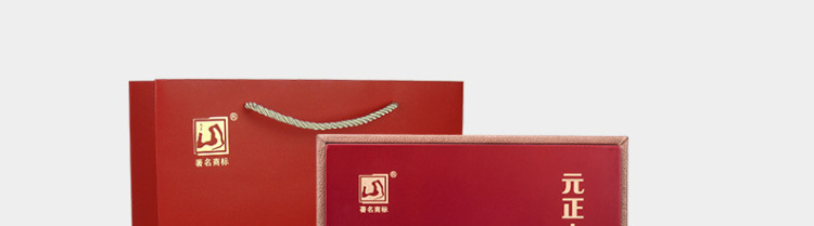 元正沁园春礼盒,高档实木制作,精致厚重,礼重情浓。优雅珊瑚红为面,端庄素黑为底,加以高贵金色logo与品名,简单大气中,充盈文化之底蕴。礼盒背面是关于元正·沁园春的源起以及产品和公司的详情介绍,茶喻意,与君悟。