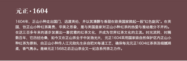 元正160为正山小种走出国门,远渡英伦纪念款,50克网购专享装新鲜上市,简单雅致的设计风格,塑封包装的保护理念,好茶简约不简单,陪伴您享受自然原的生活和领悟文化传统的精神生活。