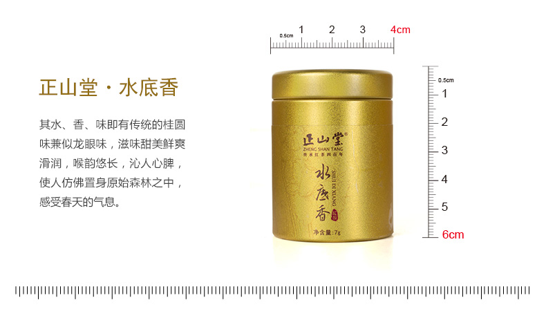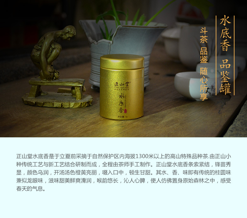 【品鉴款 水底香】品鉴款水底香,镀锡马口铁小金罐承装,密封性佳;表面经过磨砂处理,色泽柔和,低调奢华,触手有质感,罐底还有凸版烫金正山堂标志,品质优益,卓尔不群。