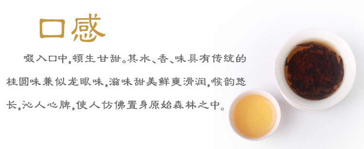 - 【主要特征】:条索紧结,锋苗秀显,颜色乌润,开汤汤色橙黄亮丽,啜入口中,顿生甘甜。其水、香、味即有传统的桂圆味兼似龙眼味,滋味甜美鲜爽滑润,喉韵悠长,沁人心脾,使人仿佛置身原始森林之中,感受春天的气息。