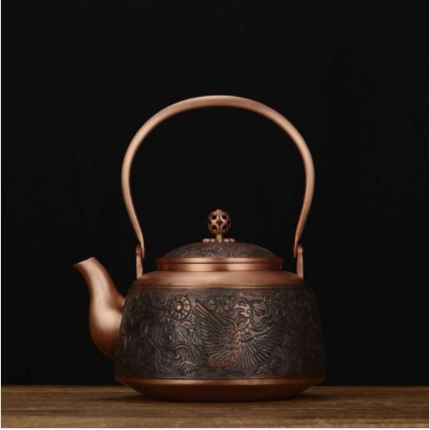 选用传统器型唐代宫廷经典纹饰而设计的仿古壶,采用凤、缠枝牡丹等传统吉祥图案为创作元素,此壶通景满工,画面呈现曲颈展翅的双凤,栩栩如生,姿态舒展华贵,凤在传统文化中被誉为鸟中之王;而牡丹则被誉为花中之王,两者结合寓意富贵吉祥,牡丹双凤呼应和谐,动静鲜明,尽显皇家风范。凤舞华章铜壶出自味茗壶美术家錾刻大师黄俊军的手笔。采用纯手工平錾满工创作,线条匀称流畅,图案布局精妙合理,錾工细致,画面典雅。