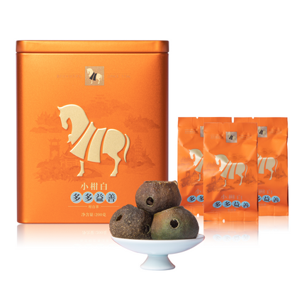 1.七月上旬头采茶枝柑幼果,源自熊(ni)子塔400米内的核心产区,搭配2019年福鼎春茶寿眉,好柑配好茶,味道顶呱呱。